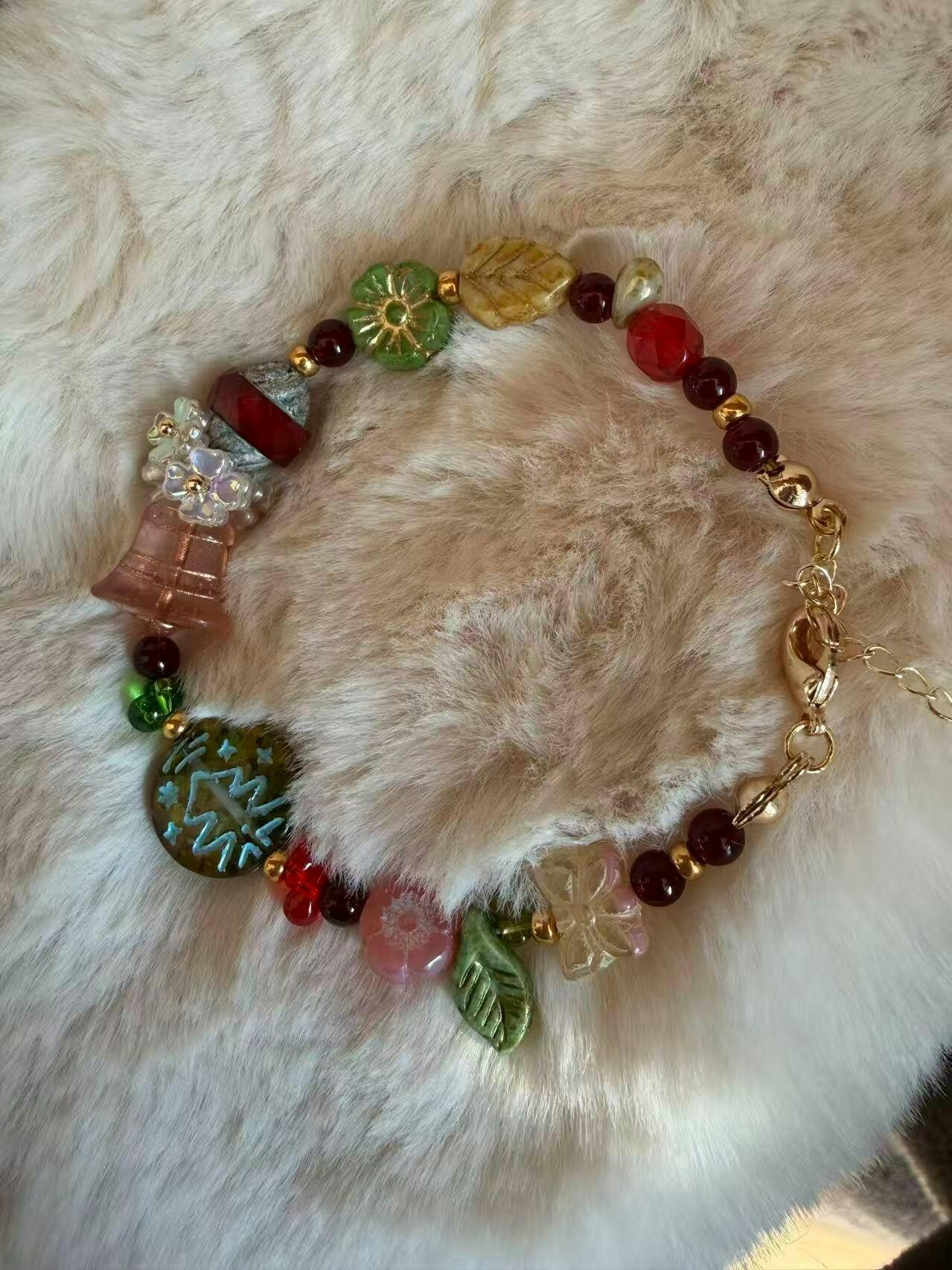 Celebrate the season with a hand-strung festive melody β a tiny Christmas tree, sparkling beads of all sizes, delicate flowers, and a jingle bell that bring a soft chime with every movement.